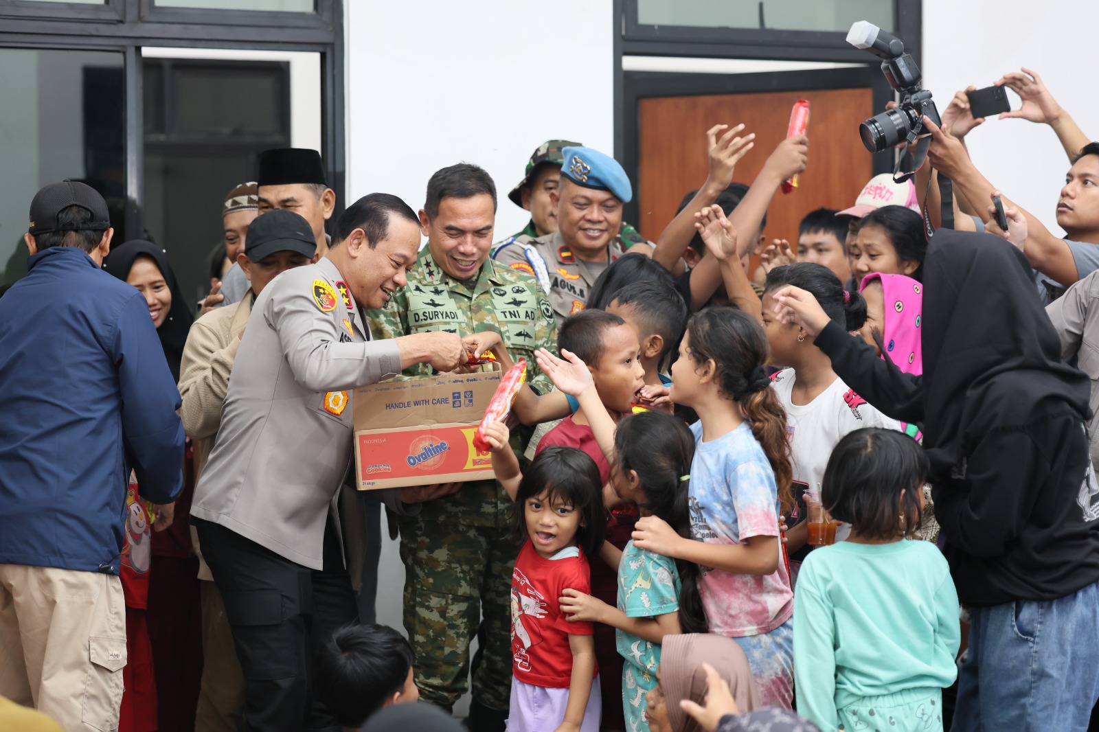 Selain menyerahkan bantuan, Kapolda dan Pangdam juga menyempatkan diri menyapa para pengungsi, termasuk anak-anak. Keduanya terlihat membagikan cokelat kepada anak-anak untuk memberikan semangat dan menghibur mereka di tengah situasi pengungsian.